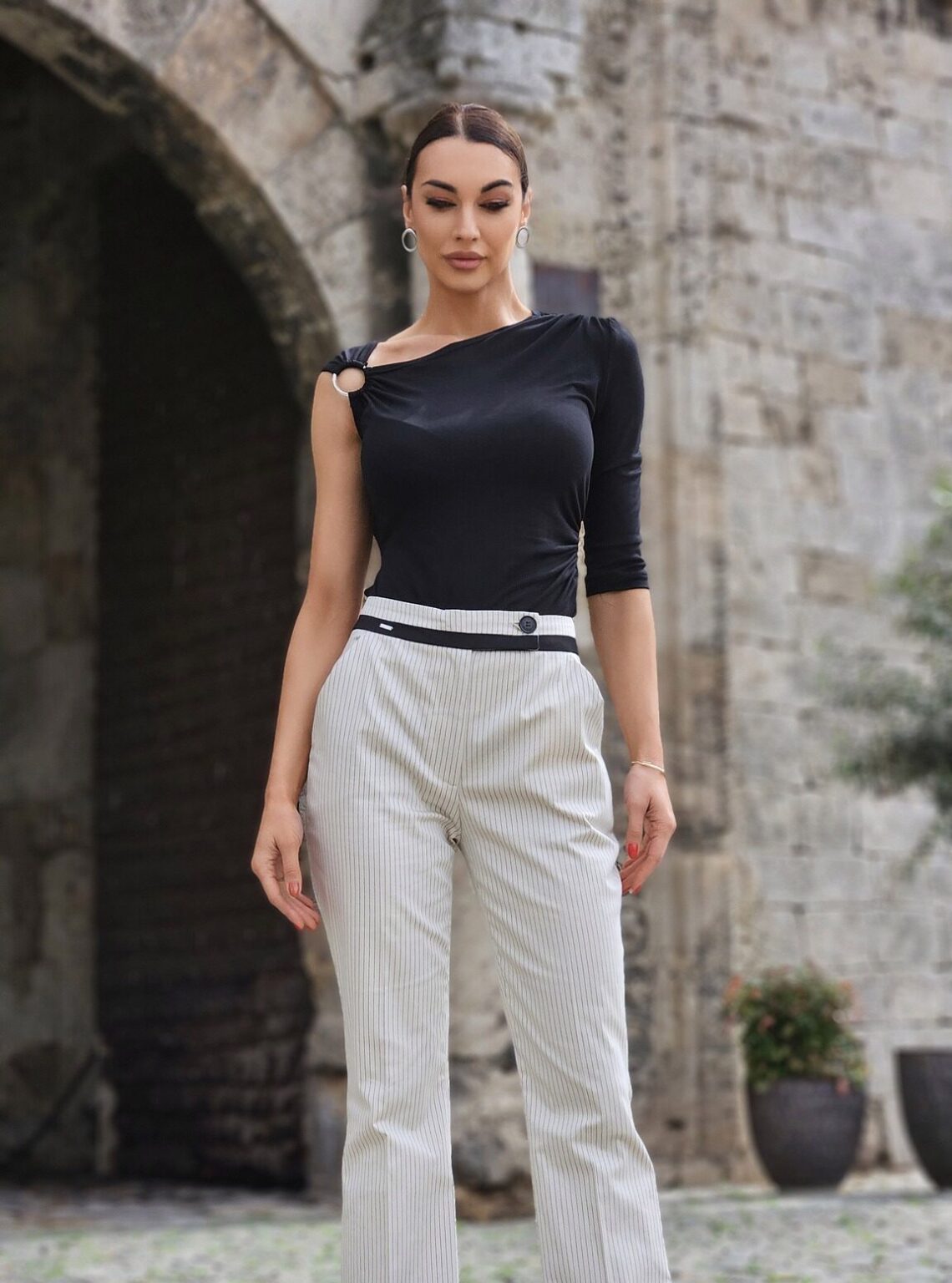 Bluza od viskoze na jedno rame ukrašena okruglom šnalom na ramenu, predstavlja „must have“ komad odeće za leto. Viskozni materijal je lagan i prijatan na koži, a kroj na jedno rame daje moderan efelat.