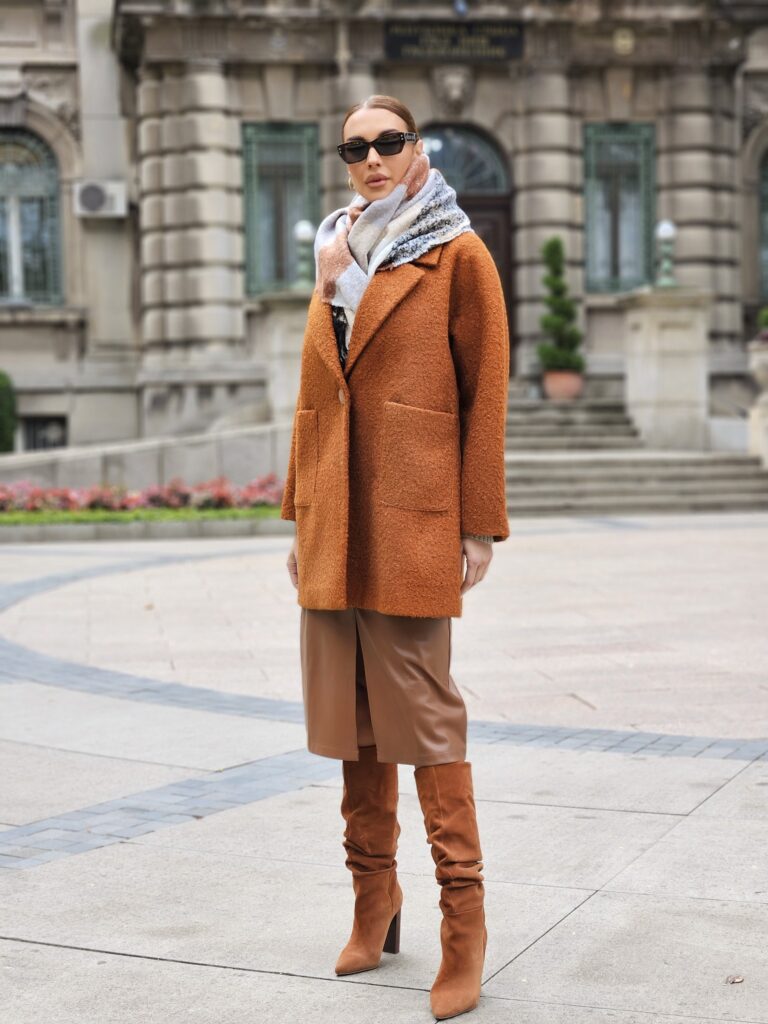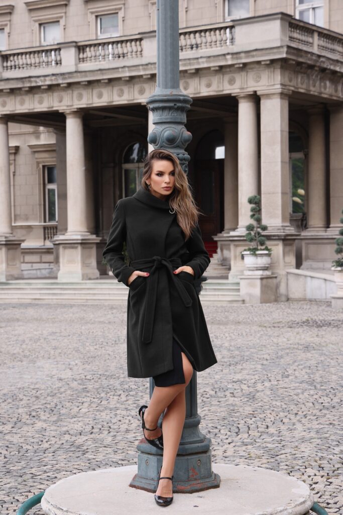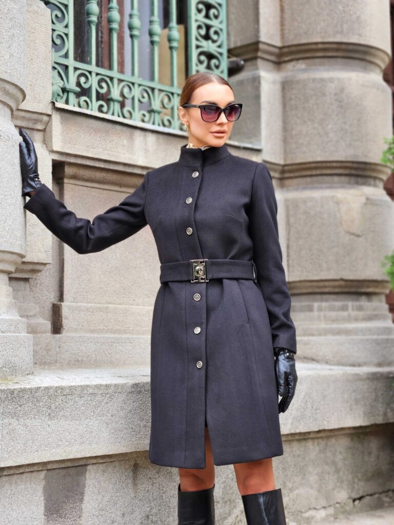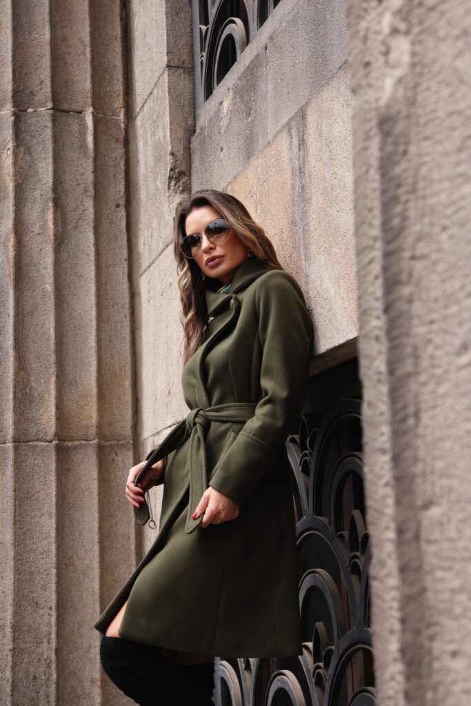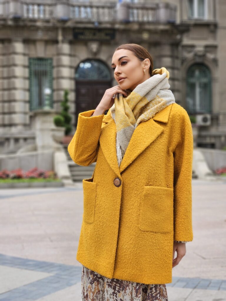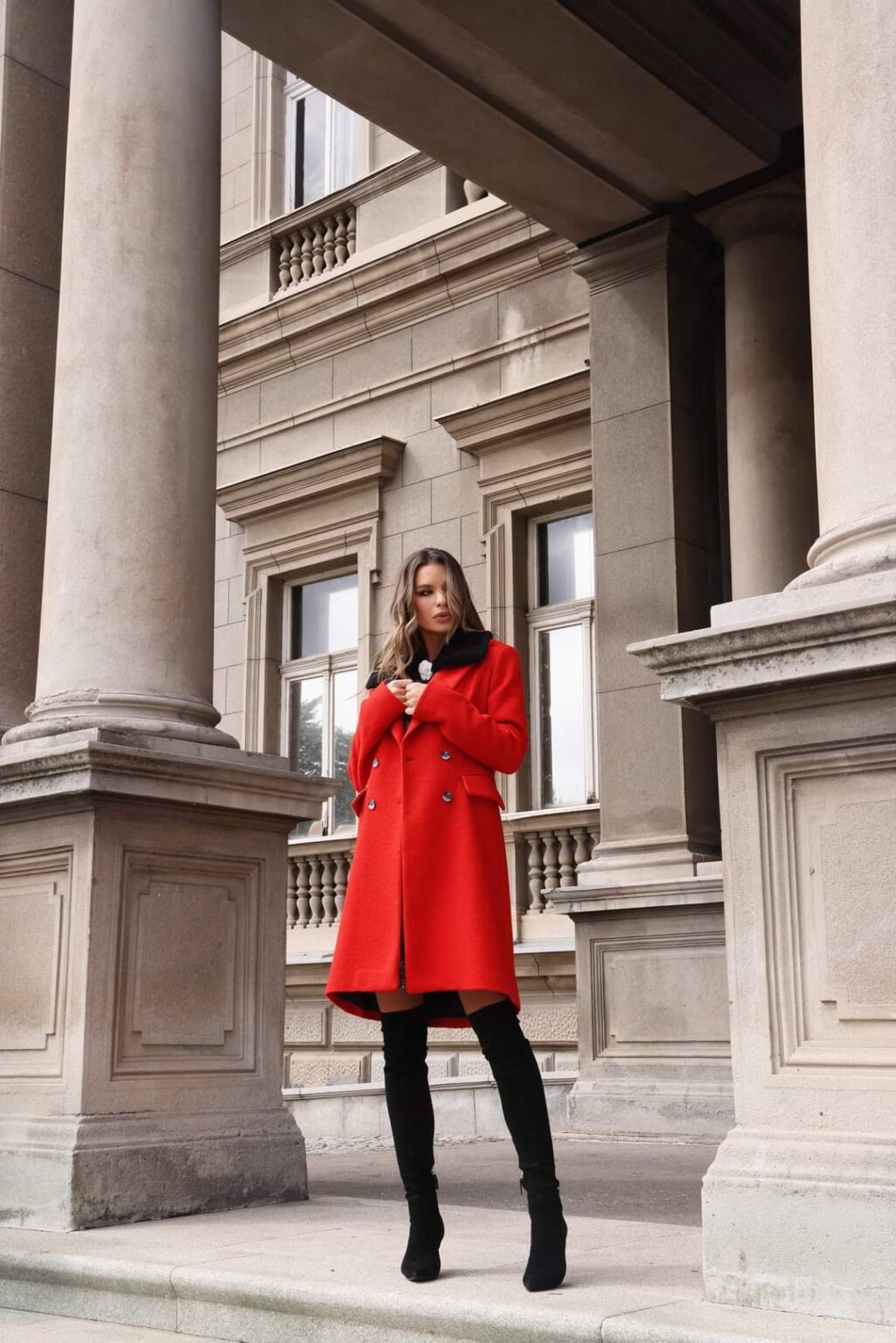 Topao i udoban kaput sa kragnom, reverima i krznom oko vrata koje se skida.Dvoredno kopčanje ukrasnim dugmićima.