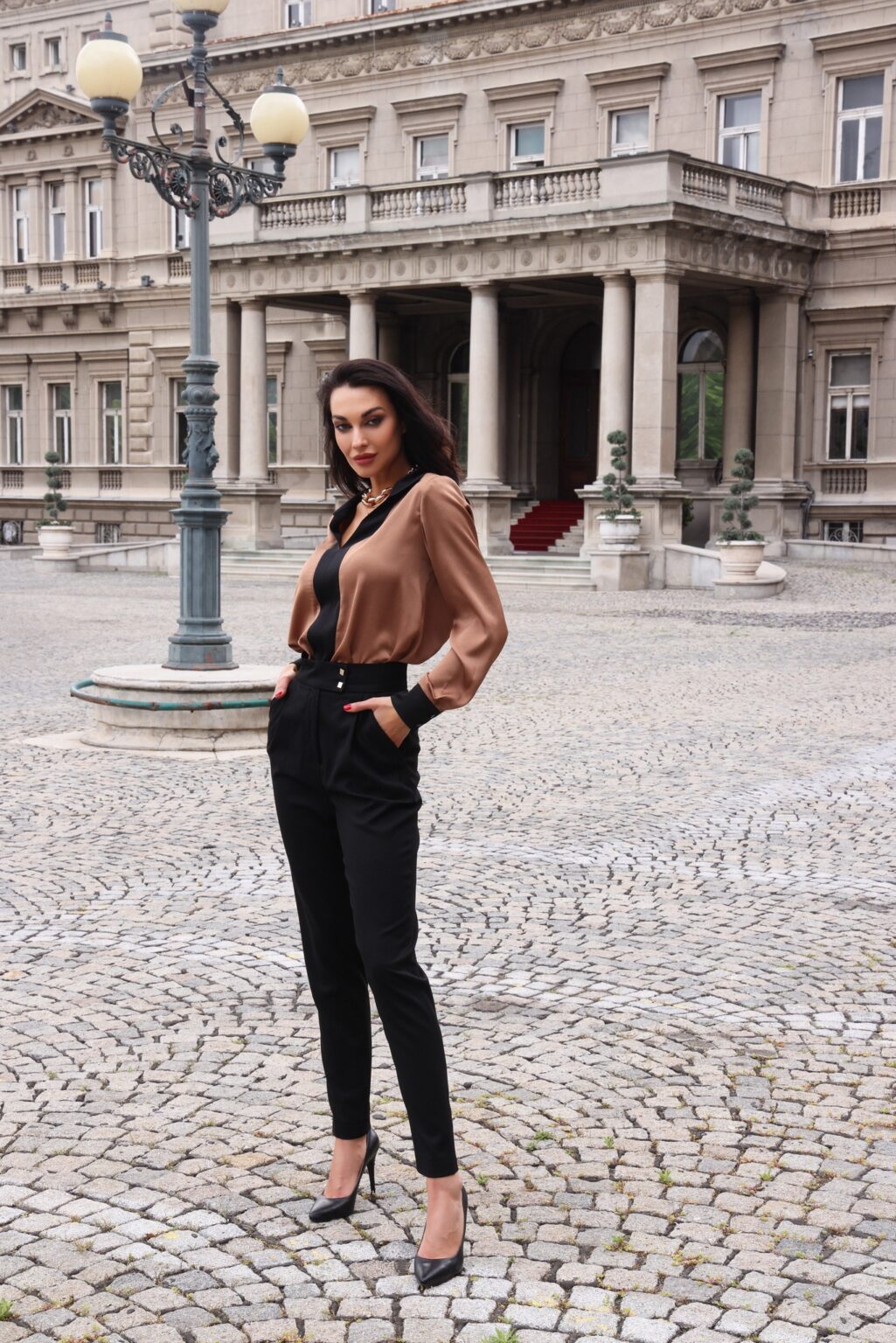 Pantalone od štofa dubljeg struka sa faltama napred užih nogavica. Prosečeni dzepovi.