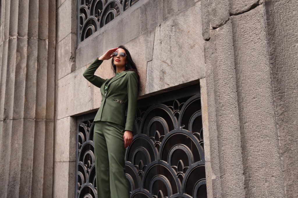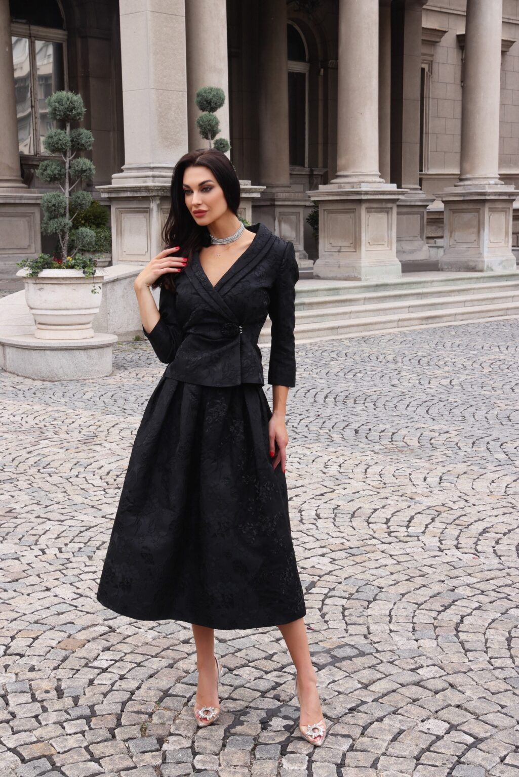 Vanvremenski sako od žakarda s V izverzom i duplom kragnom. Skriveno kopčanje na stranu ukrašeno bogatom aplikacijom.