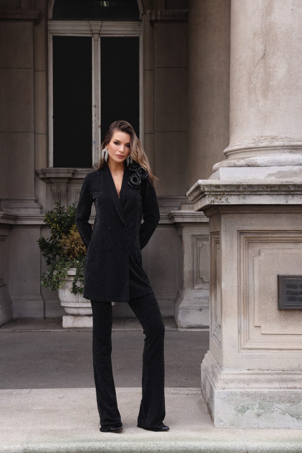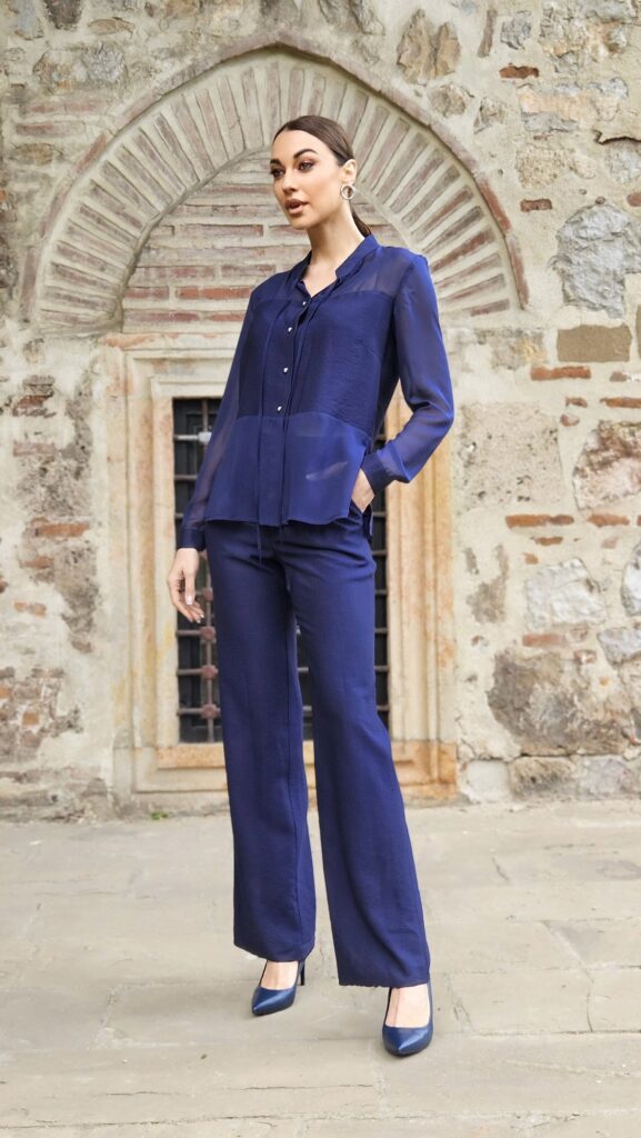 Cardigan sa šal kragnom na vezivanje i ukrasnim brošem od paspuliranih ruža. Pantalone srednje dubine blago zvonaste.
